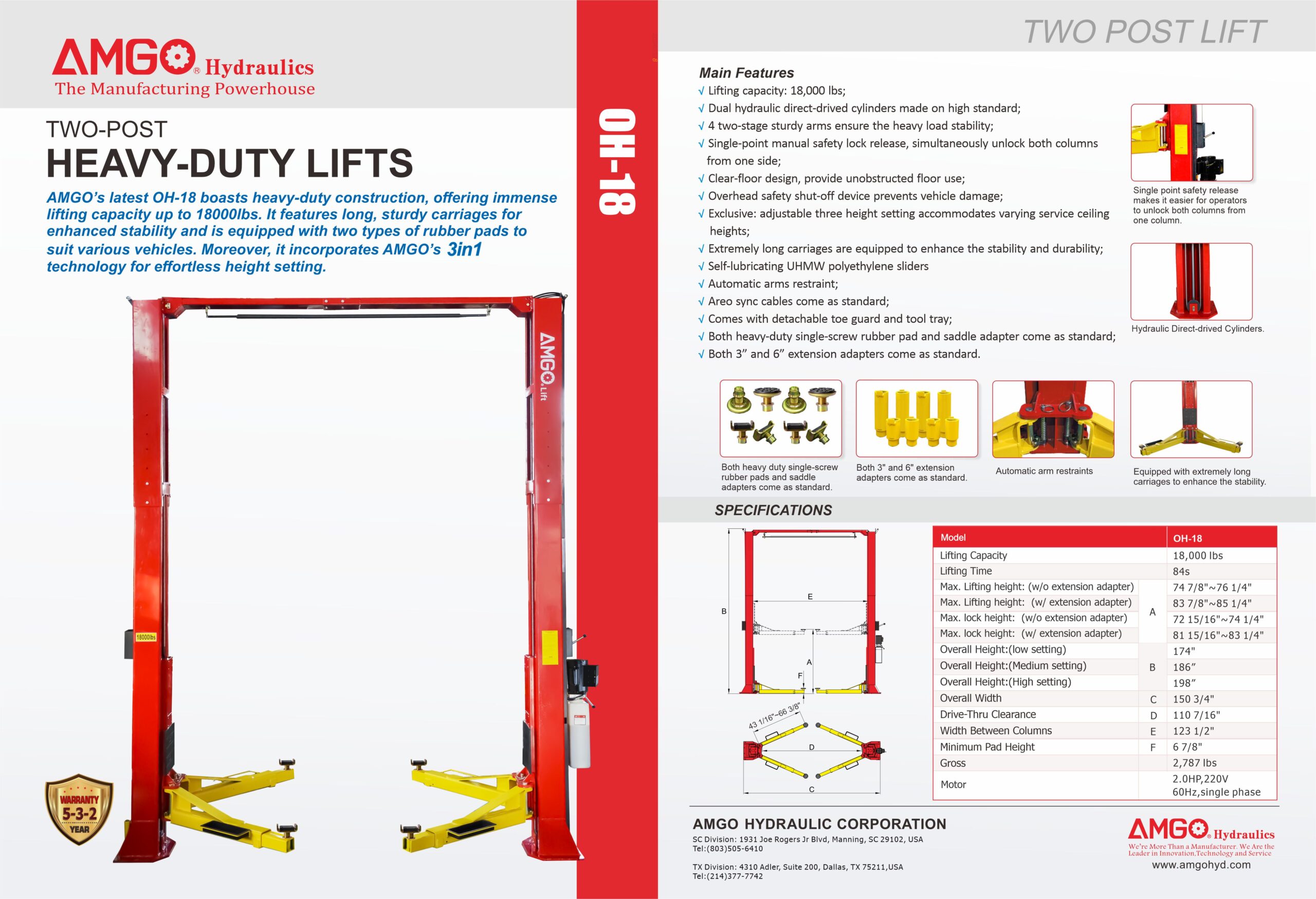 AMGO’s latest OH-18 boasts heavy-duty construction, offering immense lifting capacity up to 18000 lbs. It features long, sturdy carriages for enhanced stability and is equipped with two types of rubber pads to suit various vehicles. Moreover, it incorporates AMGO’s 3 in 1 technology for effortless height setting.