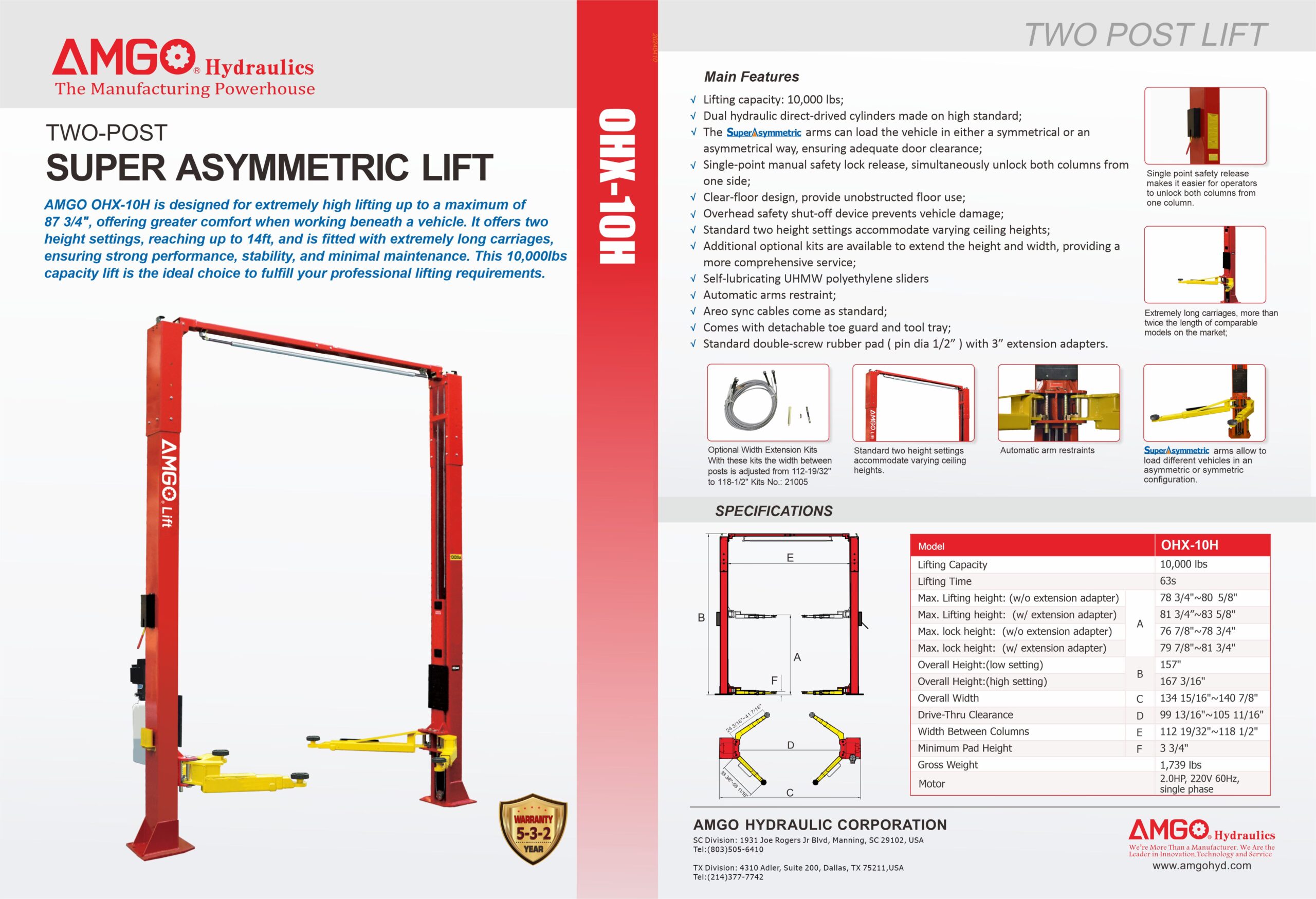 AMGO Hydraulics OHX-10H 10000 Lbs Asymmetric 2-post Lift